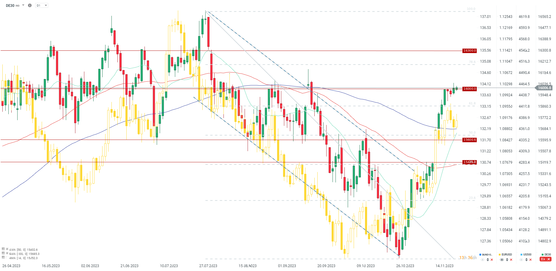 DE30 se včera podařilo uzavřít nad 16 000 body, ale začátek dnešní seance na trhu s futures byl spíše negativní. Aktuálně se kontrakt DE30 nachází nad včerejším uzavřením, několik bodů nad psychologickou úrovní 16 000 bodů. Pokud by se kontraktu dnes podařilo uzavřít nad 16 050 body, jednalo by se o nejvyšší uzavření od srpna. Za zmínku také stojí, že po dvou klesajících seancích na páru EURUSD jsme svědky odrazu, což může DE30 zvýhodnit v pokračování růstového trendu nebo alespoň udržení se nad kulatou úrovní. Evropské indexy mohou kolem 13:30, kdy bude zveřejněn zápis z jednání ECB, zaznamenat zvýšenou volatilitu.