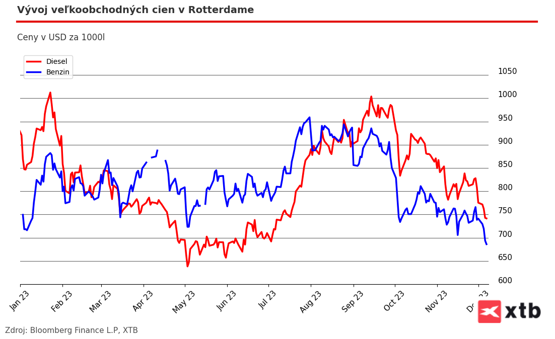 V důsledku poklesu cen ropy se snížily i velkoobchodní ceny v Rotterdamu. Podobný vývoj uvidíme i u maloobchodních cen, a tak se ceny u pump mohou jevit ještě nižší.