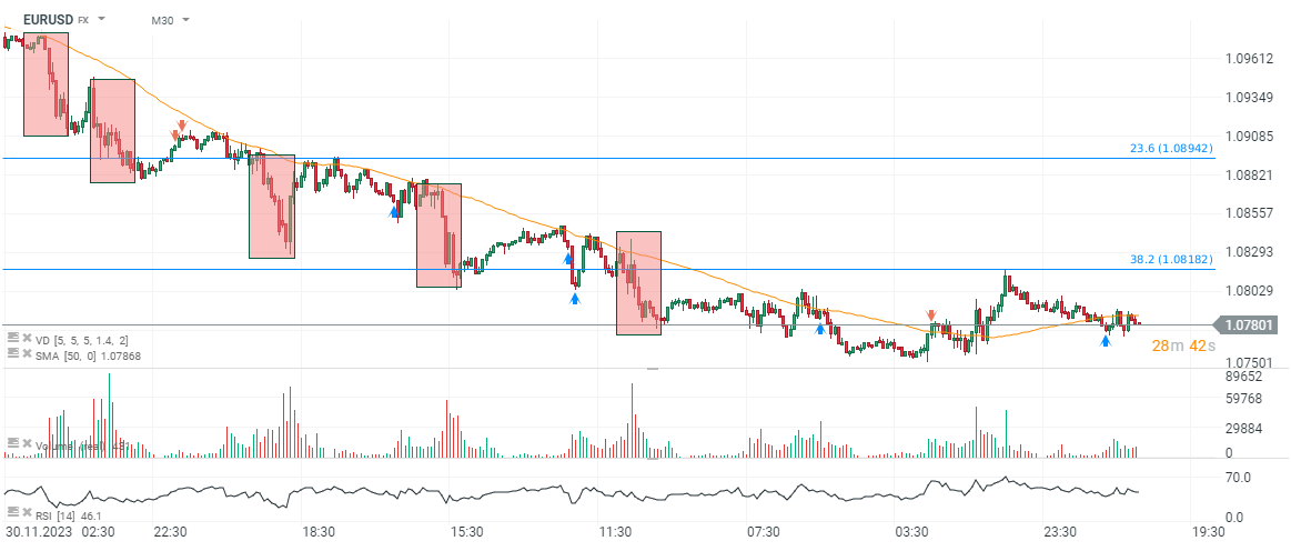 Dnes by EUR/USD mohl být rozhodně zajímavým měnovým párem vzhledem k řadě prohlášení členů Fedu a ECB, z nichž nejdůležitější bude projev Jeroma Powella ve 14:15. Zdá se, že šéf Fedu bude chtít trochu upravit poselství z poslední konference, které trhy vnímaly převážně jako holubičí - očekávání snížení sazeb Fedu se zvýšila a dnes trhy počítají se snížením o 100 bb v příštím roce a se zahájením uvolňování v červnu. Tváří v tvář několika jestřábím prohlášením několika bankéřů včetně Kashkariho, Logana a Bowmana ze včerejška může Powell potvrdit jejich narativ a zdůraznit, že pokud americká ekonomika zůstane silná – Fed bude pravděpodobně nucen zpřísnit politiku a je připraven pokračovat ve zvyšování sazeb. Nedávné údaje ADP a především NFP ukázaly, že trh práce ve Státech se stabilizuje – a hlavně ceny ropy klesají, ale přesto tvůrci politiky nemohou dopustit, aby tržní spekulace vedly k růstu inflačních očekávání – pokud je Fed vnímán jako příliš měkký. -