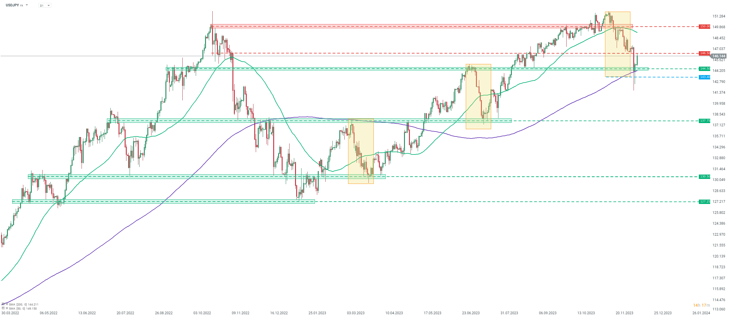 Tyto mediální zprávy mají jasně holubičí tón a trhy na ně reagují. USD/JPY si během dneška připsal 0,8 % a obchoduje se nad úrovní 146,00. Při pohledu na graf D1 vidíme, že se pár minulý týden odrazil od spodní hranice struktury Overbalance na úrovni 143,40, což naznačuje, že je stále ve hře rostoucí trend, a později zahájil pohyb k oživení. Když se přesuneme na nižší časový rámec (H4, další graf), vidíme, že dnešní růst se zastavil u klíčové zóny střednědobé rezistence - oblasti 146,50, kterou vyznačují předchozí cenové reakce, klesající trendová čára a také 50-periodový klouzavý průměr (zelená čára). Proražení nad tuto oblast by bylo silným náznakem, že korekce směrem dolů je u konce a na řadě by mohl být návrat k nedávným maximům.