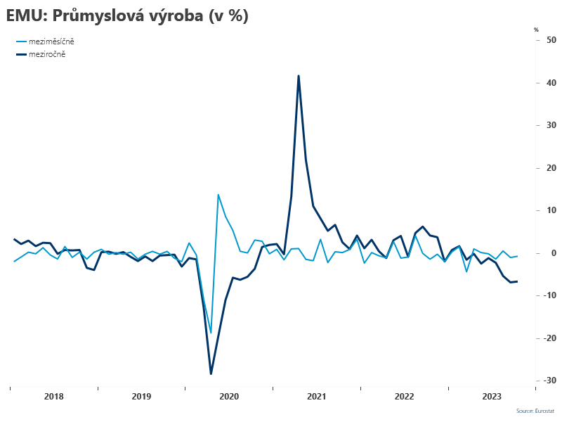 Průmyslová výroba v říjnu klesla o 0,7 % meziměsíčně a o 6,6 % meziročně oproti revidovaným -1 % m/m a -6,8 % y/y. Trhy očekávaly lepší výsledek -0,3 % meziměsíčně a -4,6 % meziročně.