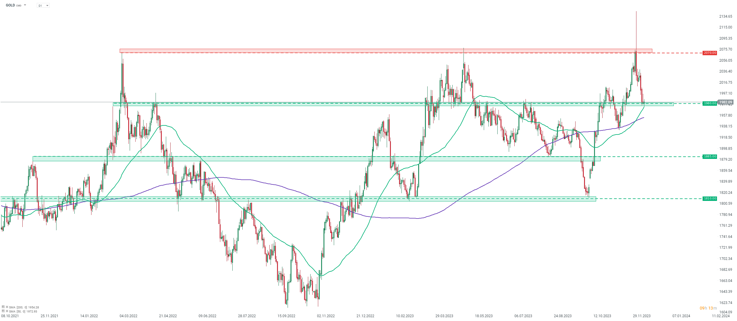 ZLATO kleslo o více než 7 % z intradenního historického maxima dosaženého na začátku předchozího týdne. Poklesy byly zastaveny na zóně podpory 1 980 USD za unci, alespoň prozatím. Nedávné stažení bylo taženo především posílením USD, a pokud Fed dnes nenaplní holubičí očekávání, může se pokles dále prohloubit. Krátkodobou podporu v případě prolomení pod hranicí 1 980 USD lze nalézt u klouzavého průměru 200 sezení (fialová čára), který se aktuálně pohybuje v oblasti 1 955 USD za unci.