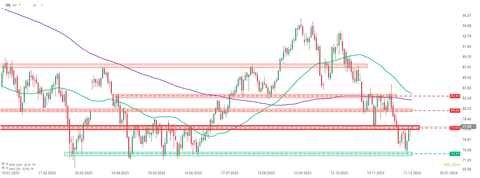Ropa Brent (OIL) pokračuje v zotavení, které bylo zahájeno po neúspěšném pokusu o prolomení zóny podpory 72,50 USD. Cena se obchoduje více než 6 % nad minimy z minulého týdne a býci se v oblasti snaží prorazit nad rezistenci 77 USD. Zdroj: xStation5