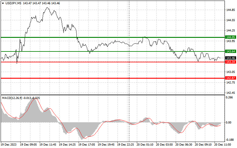 Při prodeji dbejte na to, aby linie MACD ležela pod nulou nebo od ní klesala. Prodej páru USD/JPY zvažte i po dvou po sobě jdoucích testech ceny 143,64. Linie MACD by ale měla být v překoupené oblasti, protože jen tak se trh obrátí k úrovním 143,34 a 142,87.