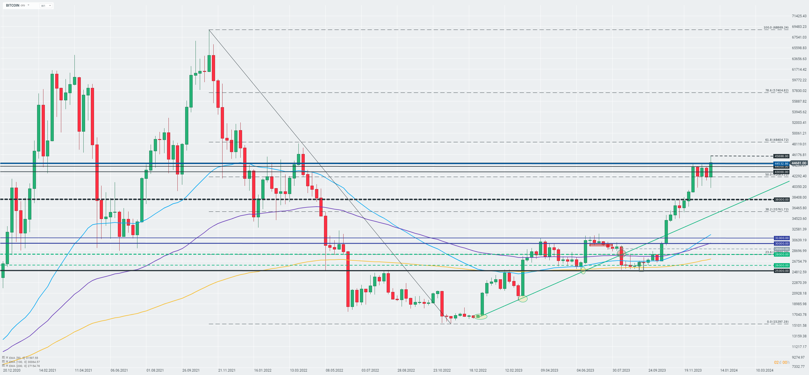 Bitcoin se vrátil nad zónu odporu stanovenou vrcholy z roku 2023. Interval W1.