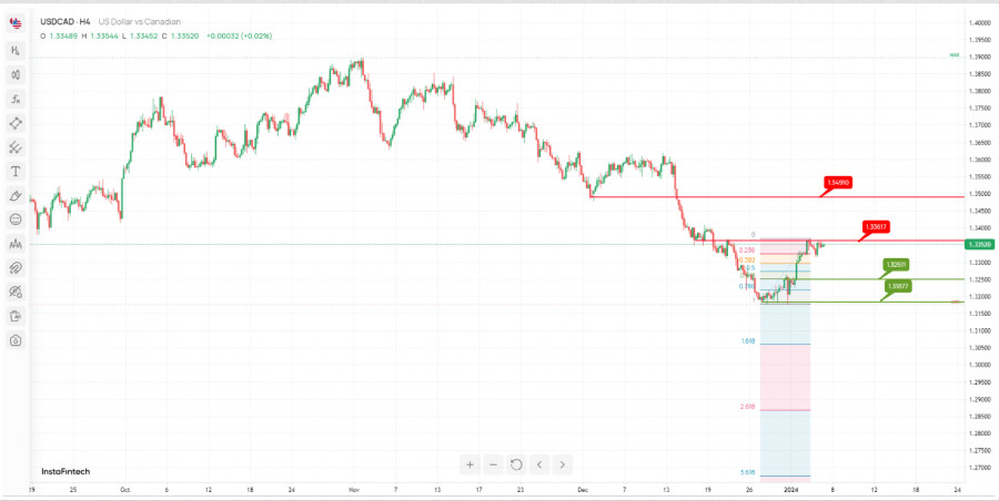 Graf měnového páru USD/CAD ukazuje silné medvědí momentum a naznačuje potenciál dalšího medvědího pohybu. Předpokládá se, že cena medvědí silou zareaguje na první rezistenci a klesne k prvnímu supportu. -