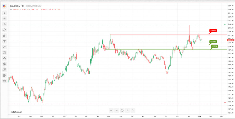 První úroveň rezistence 2 083,85 je pod vlivem "rezistence multiswingového maxima", což znamená významnou překážku dalšího růstu ceny.