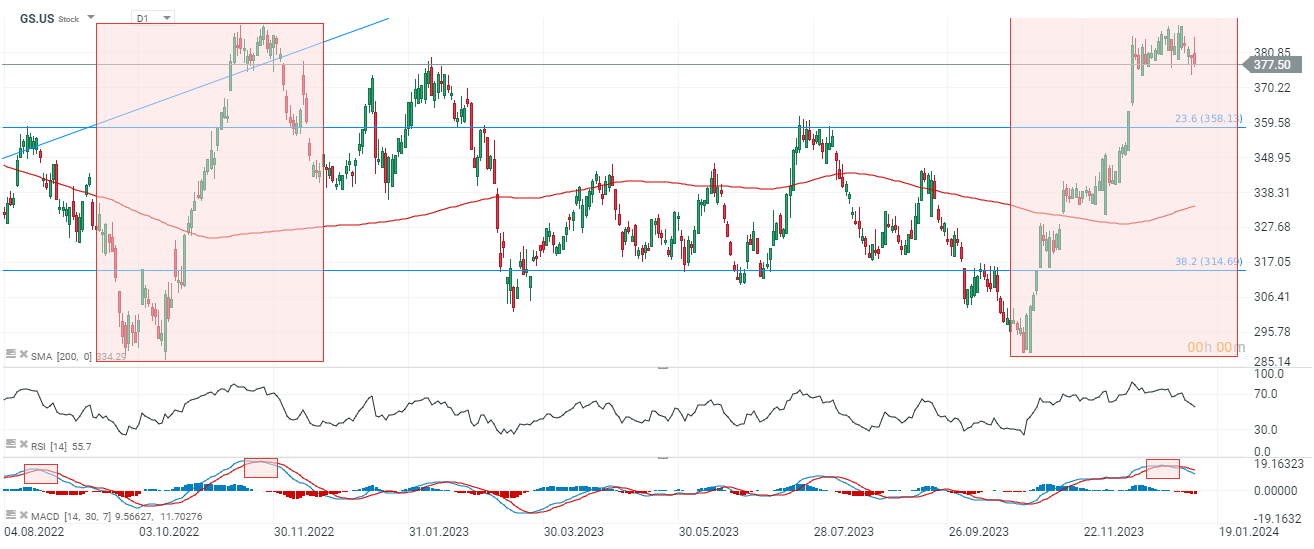 Goldman Sachs oznámila tržby z prodeje a obchodování s pevnými výnosy, měnami a komoditami (FICC) za 4Q 2023, které byly nižší než odhady analytiků. Čistý zisk a zisk na akcii však výrazně překonaly očekávání Wall Street. Banka vydělala 1,87 miliardy dolarů čistého zisku oproti 1,19 miliardy dolarů ve 4. čtvrtletí roku 2022. V investiční bance se snížily příjmy z globálního bankovnictví, zatímco ziskovost segmentu správy majetku se zvýšila. Generální ředitel banky David Salomon zdůraznil, že banka v roce 2023 realizovala svou strategii.