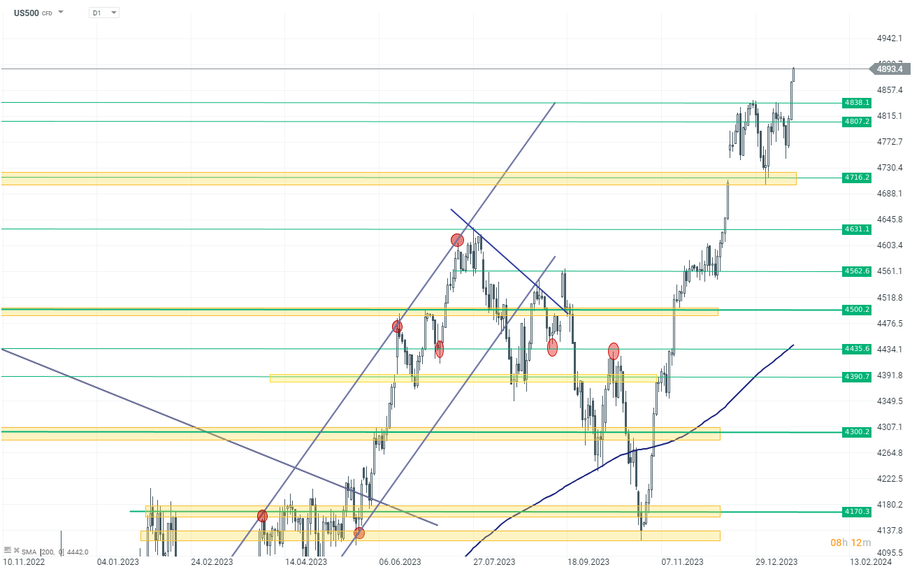 Dnes US500 získal 0,45 % po dosažení nových historických maxim na konci minulého týdne. Aktuálně se US500 udržuje těsně pod 4900 body. První úroveň, kterou je třeba v případě opravy sledovat, je horní úroveň poslední konsolidace, tedy 4830-4840 bodů.