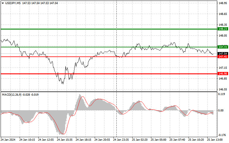 Při prodeji dbejte na to, aby linie MACD ležela pod nulou nebo od ní klesala. Prodej páru USD/JPY zvažte i po dvou po sobě jdoucích testech ceny 147,72, ale linie MACD by měla být v překoupené oblasti, protože jen tak se trh obrátí k úrovním 147,45 a 146,98.