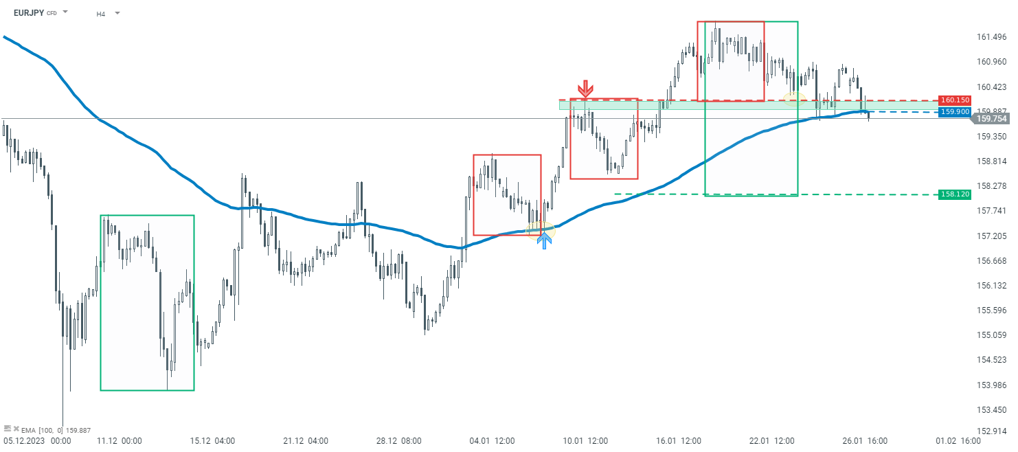 EUR/JPY se v poslední době obchoduje v rostoucím trendu. Je však třeba poznamenat, že probíhající korekce posunula pár pod klíčovou zónu podpory v oblasti 160,00 (159,90-160,15). Tato oblast je na níže uvedeném grafu označena zelenou barvou a vyplývá z předchozích cenových reakcí, spodní hranice geometrie místního trhu a také klouzavého průměru za 100 období (interval H4). Pokud bychom viděli rozhodnější a trvalejší zlom pod touto oblastí, výprodej na páru se může zrychlit. V takovém scénáři lze klíčovou zónu podpory, kterou je třeba sledovat, nalézt v oblasti 158.12, kde lze nalézt spodní hranici větší struktury Overbalance (zelené pole). Na druhou stranu návrat nad 160,15 by tento scénář zneplatnil a mohl by naznačovat obnovení pohybu nahoru.