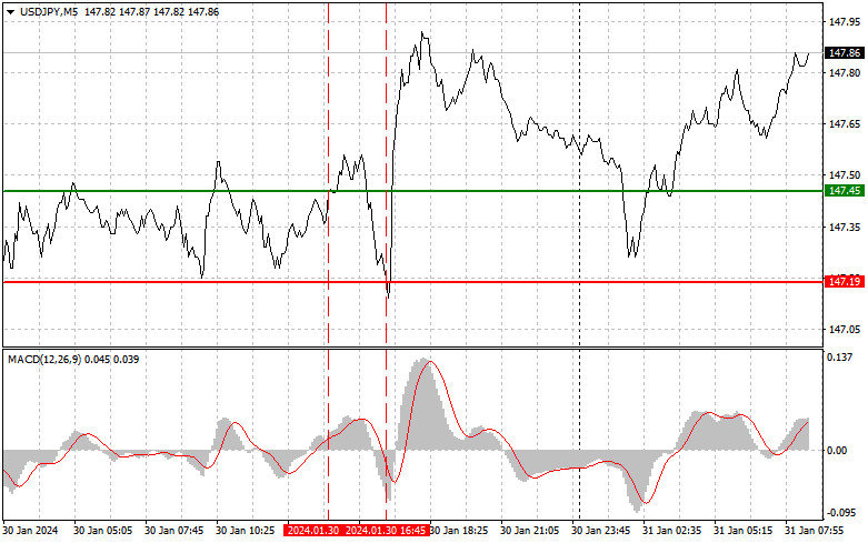 Při prodeji dbejte na to, aby linie MACD ležela pod nulou nebo od ní klesala. Prodej páru USD/JPY zvažte i po dvou po sobě jdoucích testech ceny 147,95, ale linie MACD by měla být v překoupené oblasti, protože jen tak se trh obrátí k úrovním 147,59 a 147,18.
