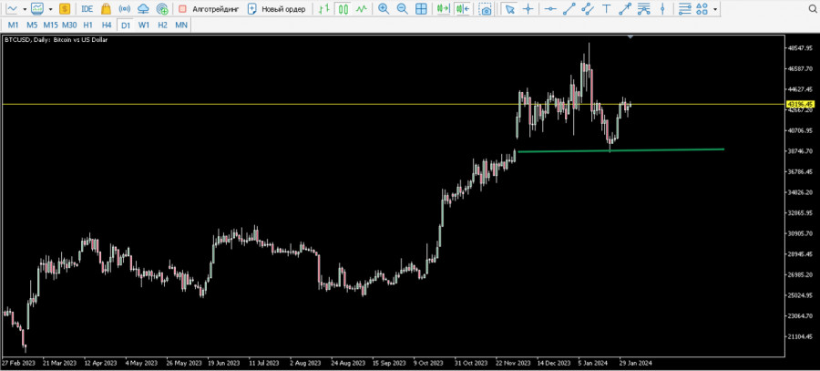 Během víkendu se obchodní aktivita na páru BTC/USD snižuje, ale makroekonomické údaje o trhu práce a spotřebitelské důvěře mohou tento scénář potenciálně změnit. Pokud se prognózy potvrdí a makroekonomická situace v USA se zhorší, pravděpodobnost, že BTC obnoví růst a pokusí se během víkendu nebo začátkem příštího týdne konsolidovat nad 44 000 USD, se výrazně zvýší. Silné ukazatele trhu práce a spotřebitelské aktivity mohou na druhou stranu posílit americký dolar a zintenzivnit korekci na kryptoměnovém trhu a Bitcoinu.