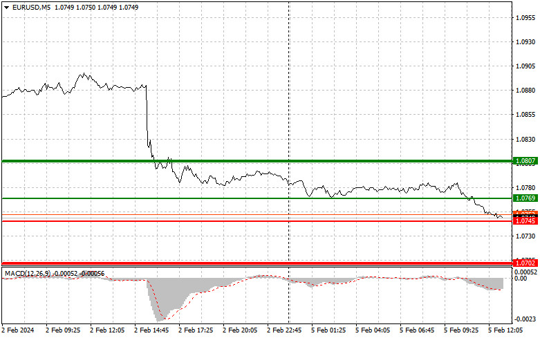 Nakupujte, když euro dosáhne úrovně 1,0807 (zelená linie v grafu) a zisk vybírejte a ceně 1,0807. Silný růst přijde po slabých údajích ze Spojených států.