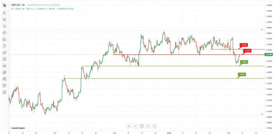 První support na úrovni 1,26100 je charakterizován jako "overlap support". Tato úroveň naznačuje oblast, kde se může projevit zájem o nákup, který ceně teoreticky může poskytnout určitou podporu. Níže je druhý support na úrovni 1,25040, označený jako "support multiswingového minima", což ukazuje na jeho význam potenciální úrovně cenové stabilizace. -