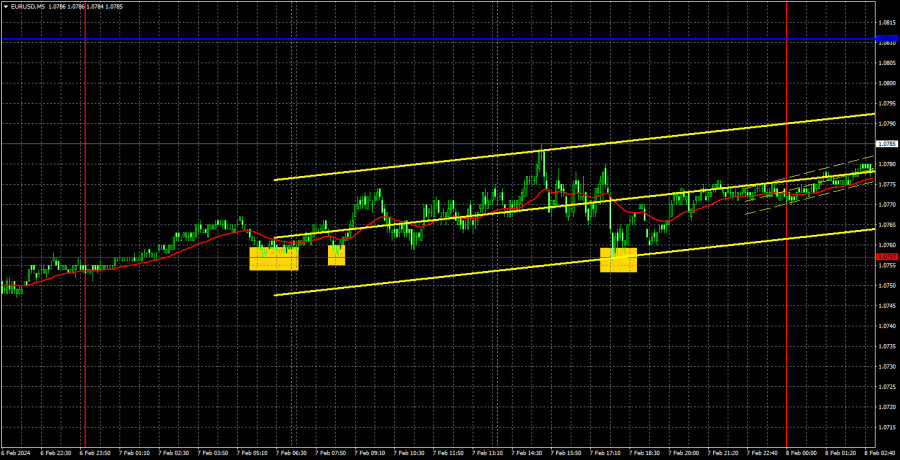 Měnový pár EUR/USD se v pátek pokusil zahájit logický pohyb směrem dolů, a to zejména když byly zveřejněny zprávy Nonfarm Payrolls a údaje o nezaměstnanosti v USA. Obě zprávy dopadly lépe, než se předpokládalo, což mělo dolar podpořit. To se také stalo, ale dolar posílil jen na krátkou dobu. Dolar v podstatě vzrostl o 50 pipsů a pak stejných 50 pipsů během několika následujících hodin ztratil. Chápeme, proč dolar vzrostl, ale je záhadou, proč klesl. Proto je poměrně obtížné vysvětlit, proč dolar nevykázal růst. Stejně jako po celý minulý týden.Připomínáme, že většina klíčových amerických zpráv dopadla pozitivně. Dolar by tedy měl minimálně čtyři z pěti dnů růst. Trh však opět rozhodl jinak. Klesající trend je formálně zachován, jak ukazuje klesající trendová linie, ale cena se již nachází nad kritickou linií. Tento týden se pár může vydat směrem dolů, což by mohla být pozdní reakce trhu na americké zprávy, ale všichni vědí, že dolar by měl růst i bez pomoci těchto zpráv. Federální rezervní systém může odložit první snížení sazeb z června na pozdější termín a Evropská centrální banka může snížit sazby již tento týden. -