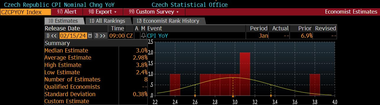 Trh i Česká národní banka shodně prognózují, že by měla být v tolerančním pásmu cílování inflace, což by stalo poprvé od června 2021. Střední hodnota expertních odhadů činí 3 %, což je horní mez tolerančního pásma. A zároveň je přesně taková i prognóza ČNB. Jednotlivé expertní odhady analytiků z trhu, jak je zachycuje agentura Bloomberg, jsou v pásmu od 2,4 do 3,8 %, s průměrem těsně pod úrovní 3 % (viz graf níže).