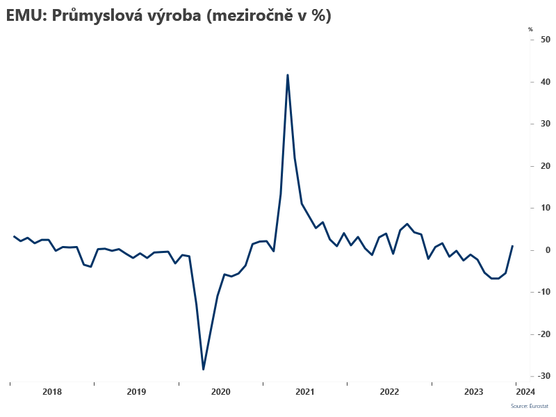 Průmyslová výroba s příchodem roku 2024 zklamala. Oproti prosinci 2023 se propadla o 2,3 procenta. Meziročně vykázala stagnaci, zatímco trh počítal se nárůstem o dvě procenta. Růst ve výrobě aut totiž nebyl natolik silný, aby kompenzoval propad zejména v těžebním a těžkém průmyslu či ve výrobě stavebních hmot. -