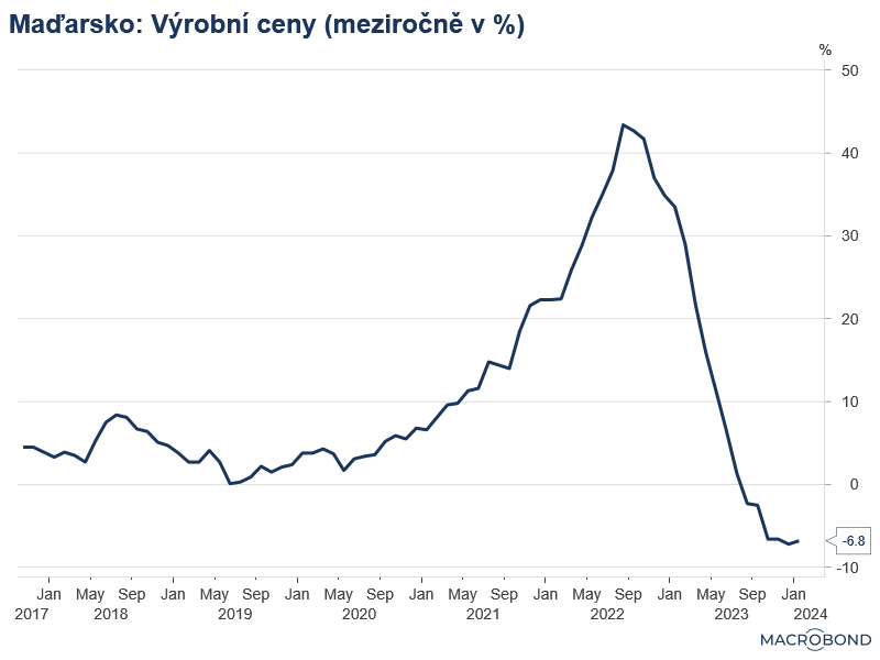 Výrobní ceny v lednu klesly o 6,8 % meziročně oproti poklesu o 7,2 % v prosinci.
