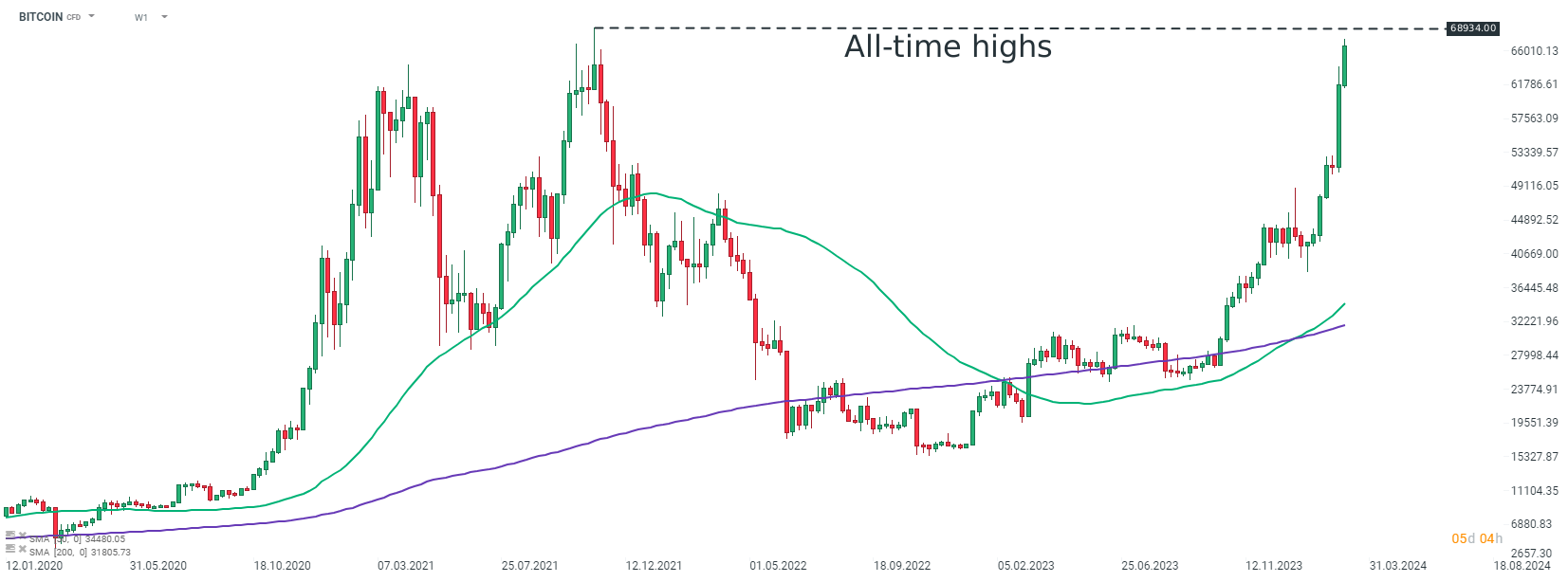 BITCOIN se dnes poprvé od listopadu 2021 vyšplhal nad hranici 67 000 USD. Coin část zisku smazal, ale i nadále se obchoduje o 6 % výše v průběhu dne. Cena se obchoduje přibližně 3 % pod historickými maximy. Zdroj: xStation5