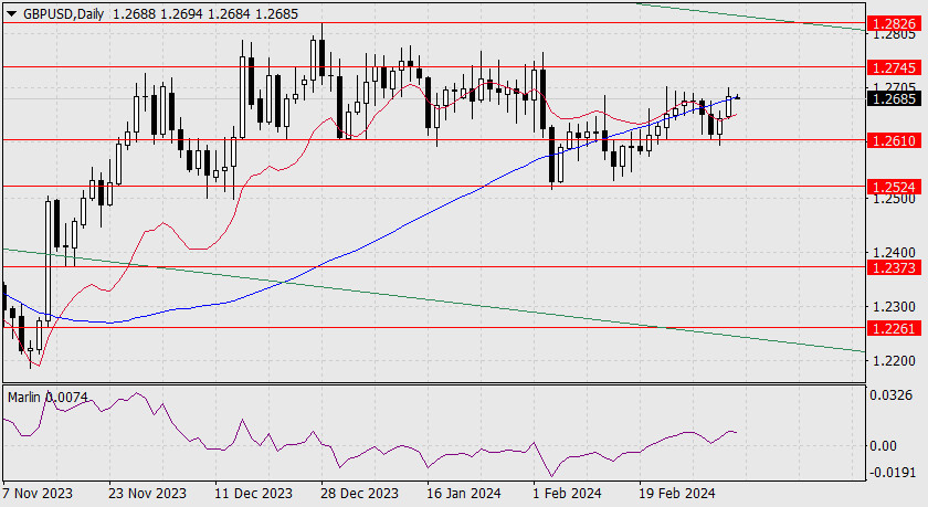 V pátek se dolarový index propadl o 0,29 %, což způsobilo, že britská libra získala 28 pipsů. Tento mírný zisk stačil na to, aby se na denním grafu vyšplhala nad linii rovnováhy a dokonce otočila oscilátor Marlin směrem vzhůru. -