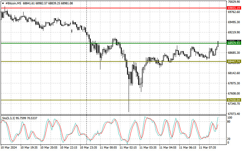 Můj přístup spočívá v otevření dlouhé pozice na bitcoinu kolem hranice 68 929 USD s cílem dostat cenu nahoru na úroveň 69 855 USD. Po dosažení této hranice plánuji dlouhou pozici zlikvidovat a při odrazu se zapojit do krátkého prodeje. Před provedením této long strategie je nezbytné ověřit, že oscilátor Stochastic signalizuje přeprodané podmínky, ideálně na pozici poblíž indexu 20, aby bylo možné využít potenciálních obratů směrem vzhůru.