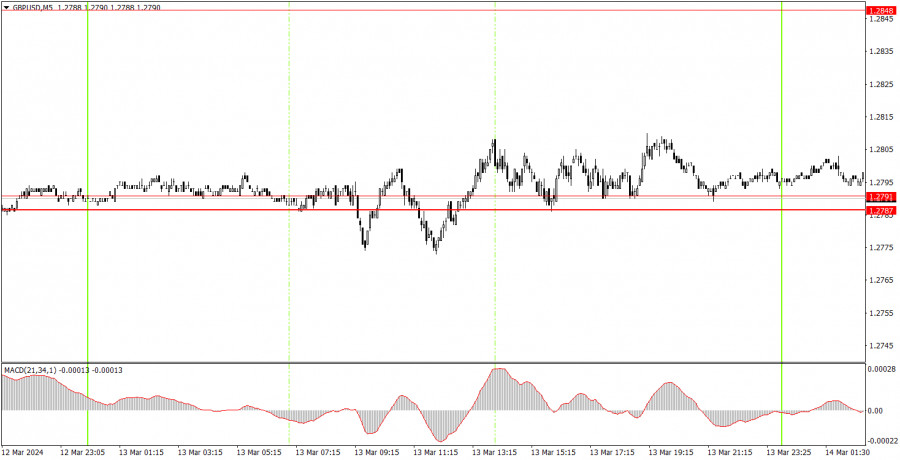 V časovém rámci 5M se pár pohyboval do strany. V obchodním pásmu se bohužel nacházely úrovně 1,2787 a 1,2791, takže cena je během dne dokázala překonat jen čtyřikrát. Kromě toho se od uvedené oblasti čtyřikrát odrazila. Všechny tyto signály se při flatu přirozeně ukázaly jako falešné, takže jsme se neobtěžovali ani na ně poukazovat. Znovu připomínáme, že je těžké očekávat dobrý zisk, když je volatilita slabá a trend vůbec žádný.