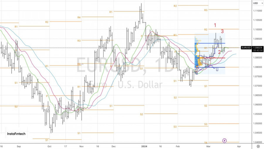 Z technického hlediska na denním grafu EUR/USD pokračuje realizace formace 1-2-3. Býci se pokusili zahrát doji bar a protiútok, ale úroveň pivotu na hladině 1,0905 je zastavila. Dokud se bude kotace nacházet pod touto úrovní, měli by se obchodníci zaměřit na prodej a příležitostně doplňovat krátké pozice vytvořené od úrovně 1,0945.