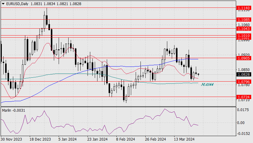 Na denním grafu včera euru v dalším poklesu zabránila linie ukazatele rovnováhy. Dnes ráno se cena snaží tento support opět překonat. Celkově cena čelí silnému a širokému rozpětí, které brání medvědům v útoku – 1,0788–1,0808 – od MA144 k linii rovnováhy. Překonání takové překážky otevře páru možnost poklesu na 1,0632 – minimum z října 2023. -