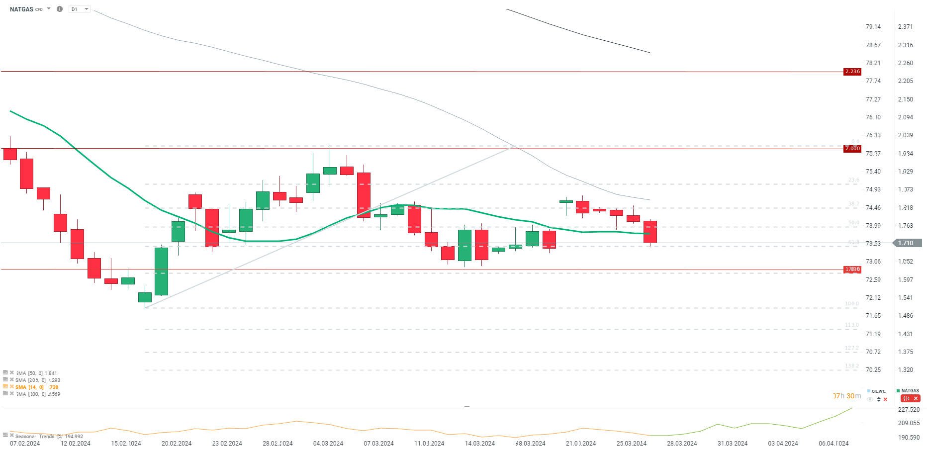 NATGAS klesá pod 14denní klouzavý průměr. Pokud by NATGAS dokončil dnešní obchodování pod touto překážkou, mohlo by to připravit cestu k poklesu směrem k 78,6% retracementu. Zdroj: xStation5