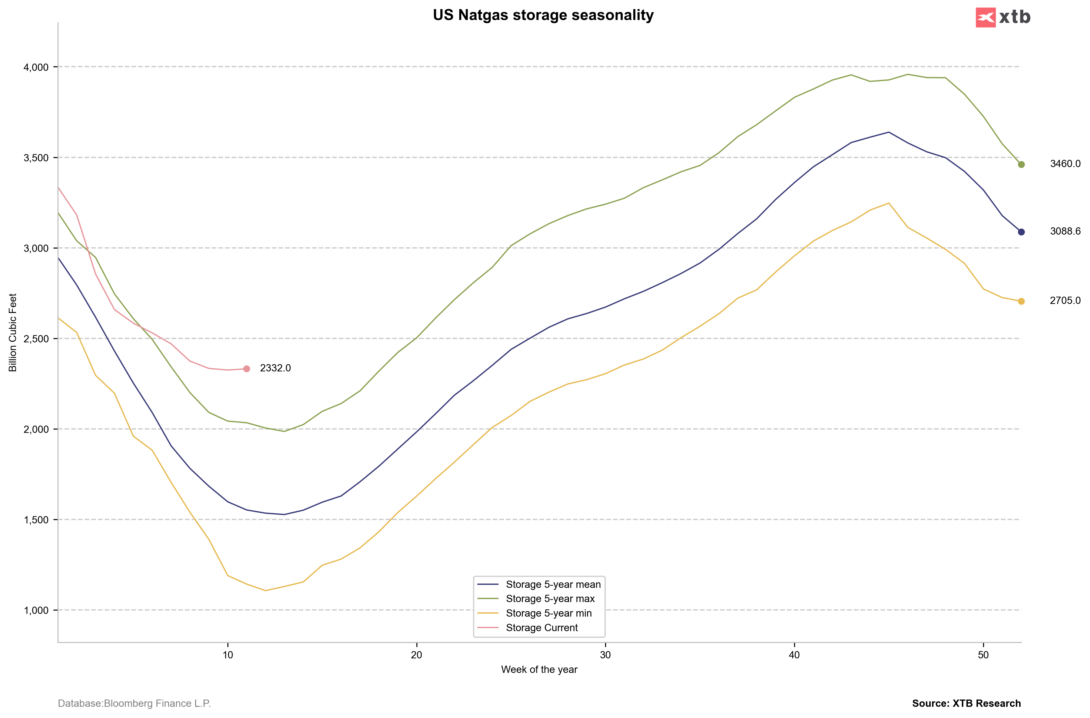 První obchodní seance nového týdne se nese ve znamení velkého poklesu cen zemního plynu v USA (NATGAS). Komodita se v době tisku obchoduje o více než 5 % níže. Ceny se obchodují pod tlakem poté, co nové prognózy ukázaly na nadprůměrné teploty napříč Spojenými státy v blízké budoucnosti. Vysoké zásoby navíc ztěžují zahájení dlouhodobějšího pohybu nahoru. Zásoby v Evropě jsou poprvé od roku 2009 naplněny z 99,5 %. -