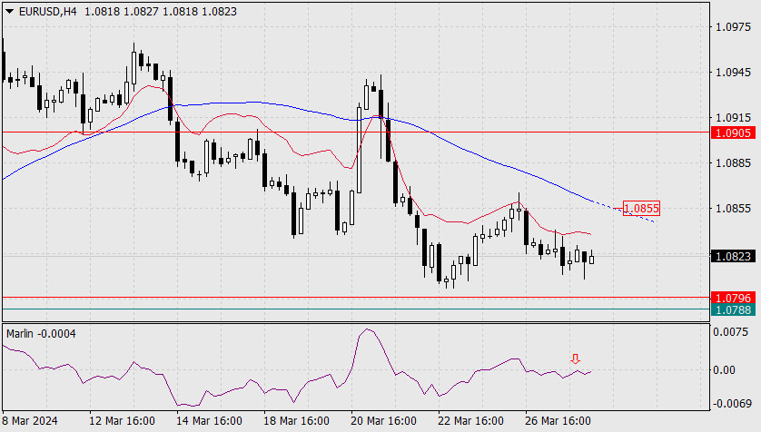 Na denním grafu včera euru v dalším poklesu zabránila linie ukazatele rovnováhy. Dnes ráno se cena snaží tento support opět překonat. Celkově cena čelí silnému a širokému rozpětí, které brání medvědům v útoku – 1,0788–1,0808 – od MA144 k linii rovnováhy. Překonání takové překážky otevře páru možnost poklesu na 1,0632 – minimum z října 2023.