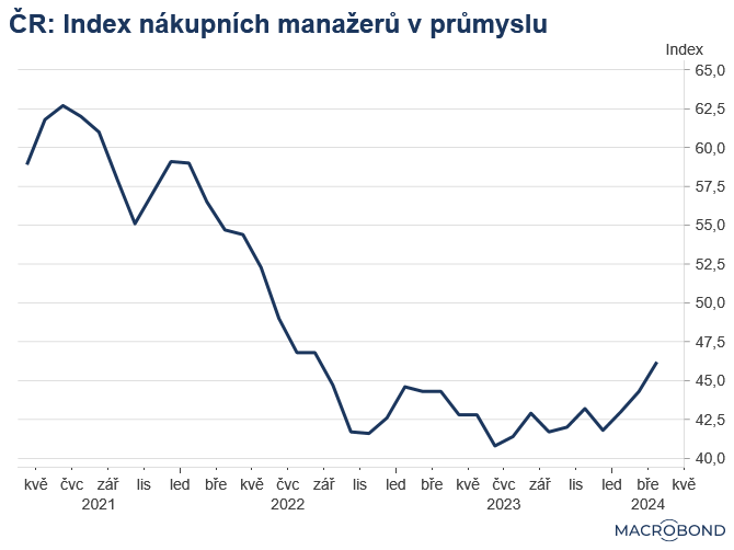 Index nákupních manažerů v průmyslu v březnu stoupl na 46,2 b. oproti 44,3 b. v únoru. Trhy očekávaly růst na 44,8 b.