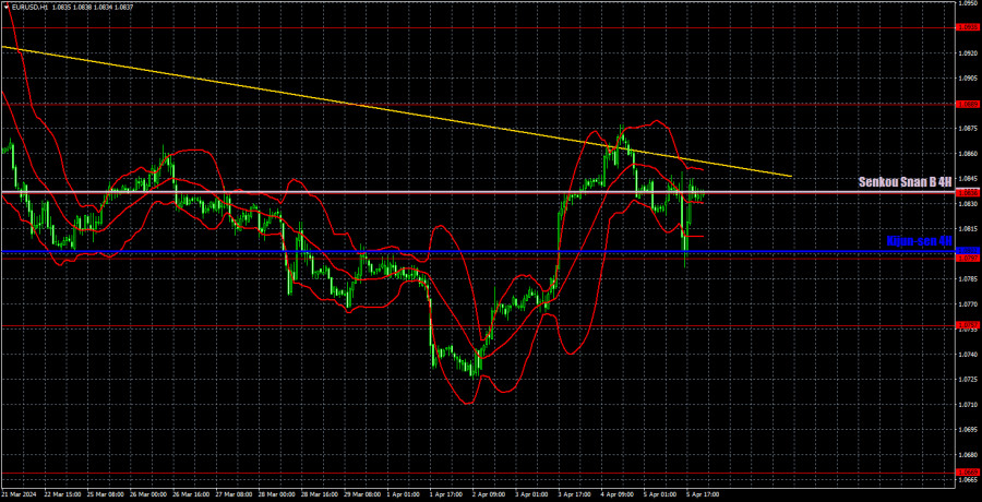 Měnový pár EUR/USD se v pátek pokusil zahájit logický pohyb směrem dolů, a to zejména když byly zveřejněny zprávy Nonfarm Payrolls a údaje o nezaměstnanosti v USA. Obě zprávy dopadly lépe, než se předpokládalo, což mělo dolar podpořit. To se také stalo, ale dolar posílil jen na krátkou dobu. Dolar v podstatě vzrostl o 50 pipsů a pak stejných 50 pipsů během několika následujících hodin ztratil. Chápeme, proč dolar vzrostl, ale je záhadou, proč klesl. Proto je poměrně obtížné vysvětlit, proč dolar nevykázal růst. Stejně jako po celý minulý týden.Připomínáme, že většina klíčových amerických zpráv dopadla pozitivně. Dolar by tedy měl minimálně čtyři z pěti dnů růst. Trh však opět rozhodl jinak. Klesající trend je formálně zachován, jak ukazuje klesající trendová linie, ale cena se již nachází nad kritickou linií. Tento týden se pár může vydat směrem dolů, což by mohla být pozdní reakce trhu na americké zprávy, ale všichni vědí, že dolar by měl růst i bez pomoci těchto zpráv. Federální rezervní systém může odložit první snížení sazeb z června na pozdější termín a Evropská centrální banka může snížit sazby již tento týden.