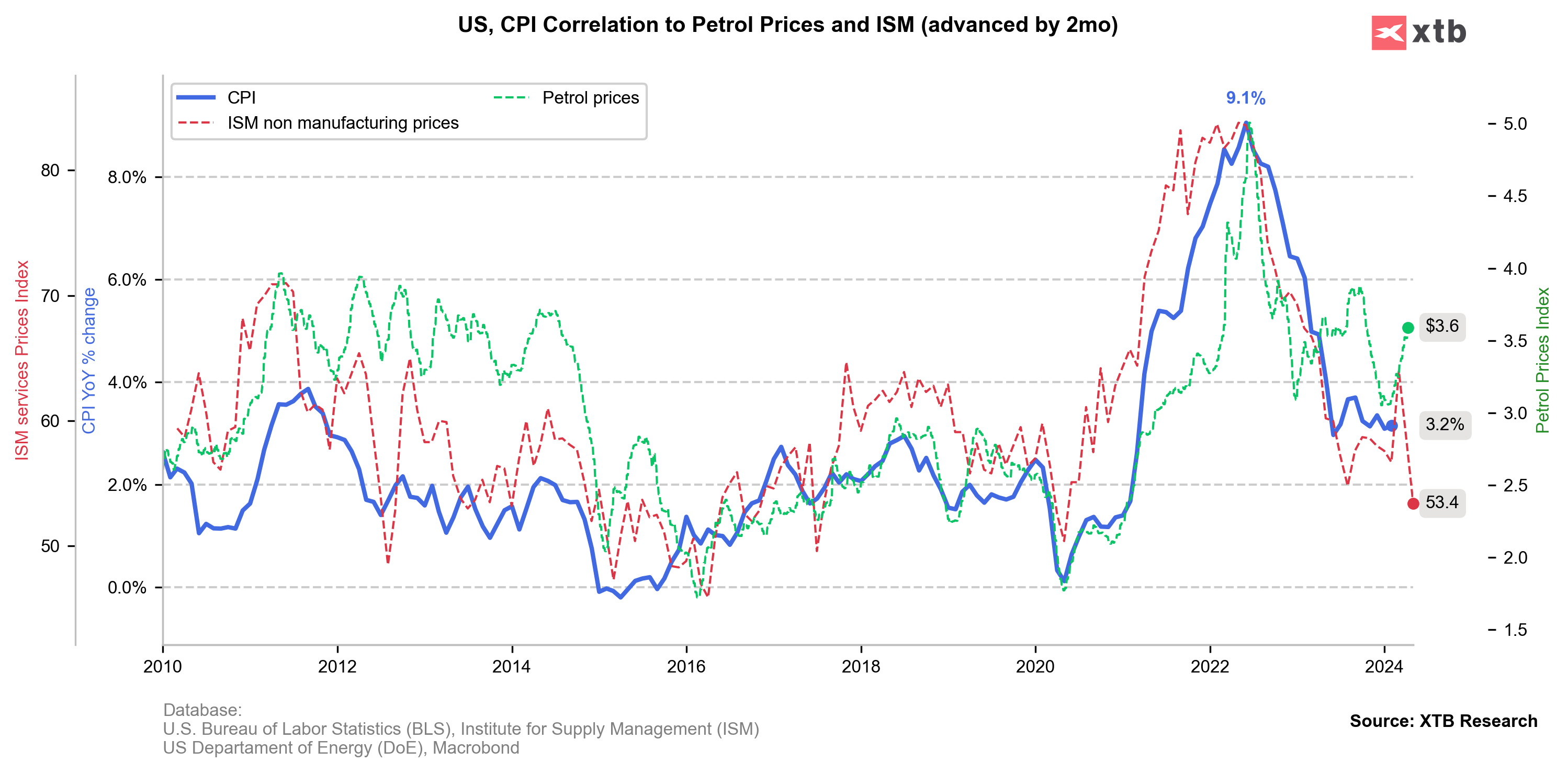Zatímco nevýrobní údaje ISM naznačují silný dezinflační impuls v březnu, ceny benzinu se vyšplhaly výše a vysílají protichůdný signál. Zdroj: Bloomberg Finance LP, XTB Research