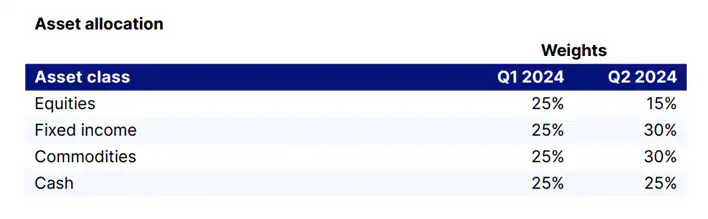 Naše investiční strategie v průběhu prvního čtvrtletí zahrnovala vyváženou alokaci po 25 % do 4 klíčových tříd aktiv: akcií, pevného výnosu, komodit a hotovosti/alternativ. Tato diverzifikace nám dobře posloužila, ale s přechodem do 2. čtvrtletí upravujeme naši alokaci snížením expozice vůči akciím kvůli obavám z ocenění.