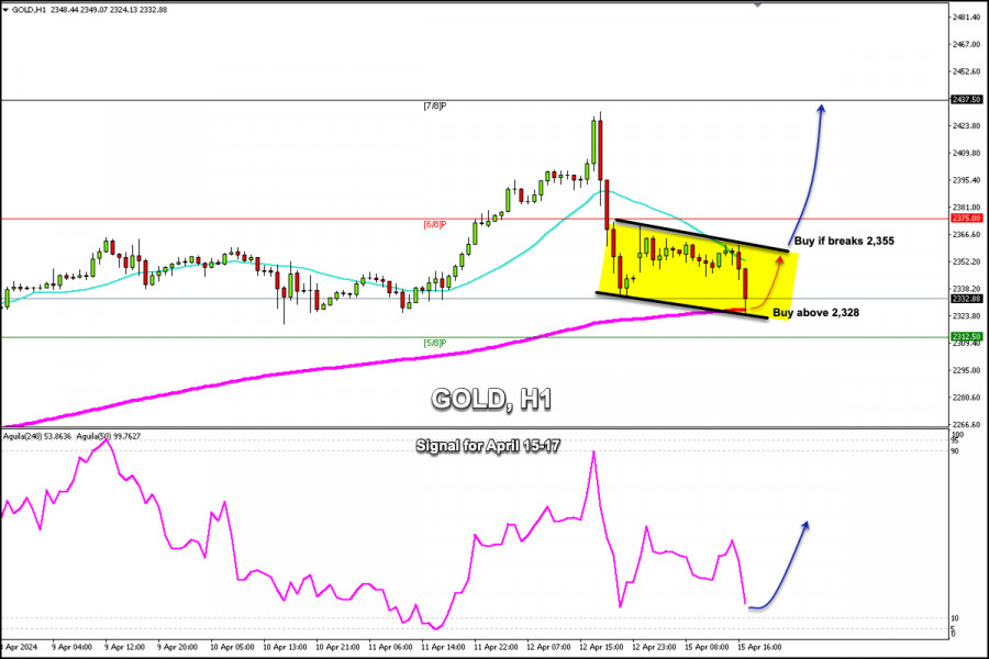 Obchodní signály pro ZLATO (XAU/USD) na období 15.–17. dubna 2024: nákup nad 2 328 USD (200 EMA – 5/8 Murray)