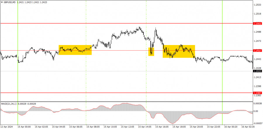 Pohyby a obchodní signály v časovém rámci 5M nebyly nejlepší. Během evropské obchodní seance se kolem úrovně 1,2457 vytvořil signál k nákupu, ale cena jen o několik pipů netrefila cílovou úroveň 1,2502. Následně se odrazila od úrovně 1,2457, ale ani tentokrát nedosáhla cílové úrovně. První dva signály by se tedy daly považovat za falešné a třetí signál kolem úrovně 1,2457 neměl být realizován. Zisku z obou obchodů bylo možné dosáhnout jen v případě, že obchody byly manuálně zavřeny.