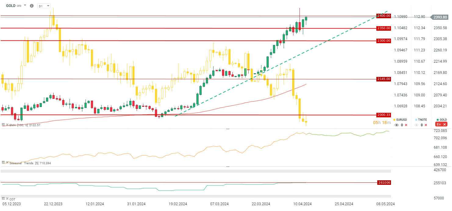 V posledních minutách jsme svědky prohlubující se divergence mezi zlatem a dolarem. Kov testuje hodnotu kolem 2400 dolarů za unci v návaznosti na zprávu, že Izrael hodlá Íránu oplatit nejnovější odvetný útok. Ještě včera se zdálo, že se situace deeskaluje, ale ukazuje se, že se může ještě více vyostřit. Hodně se také spekuluje o dalších sankcích vůči Íránu.