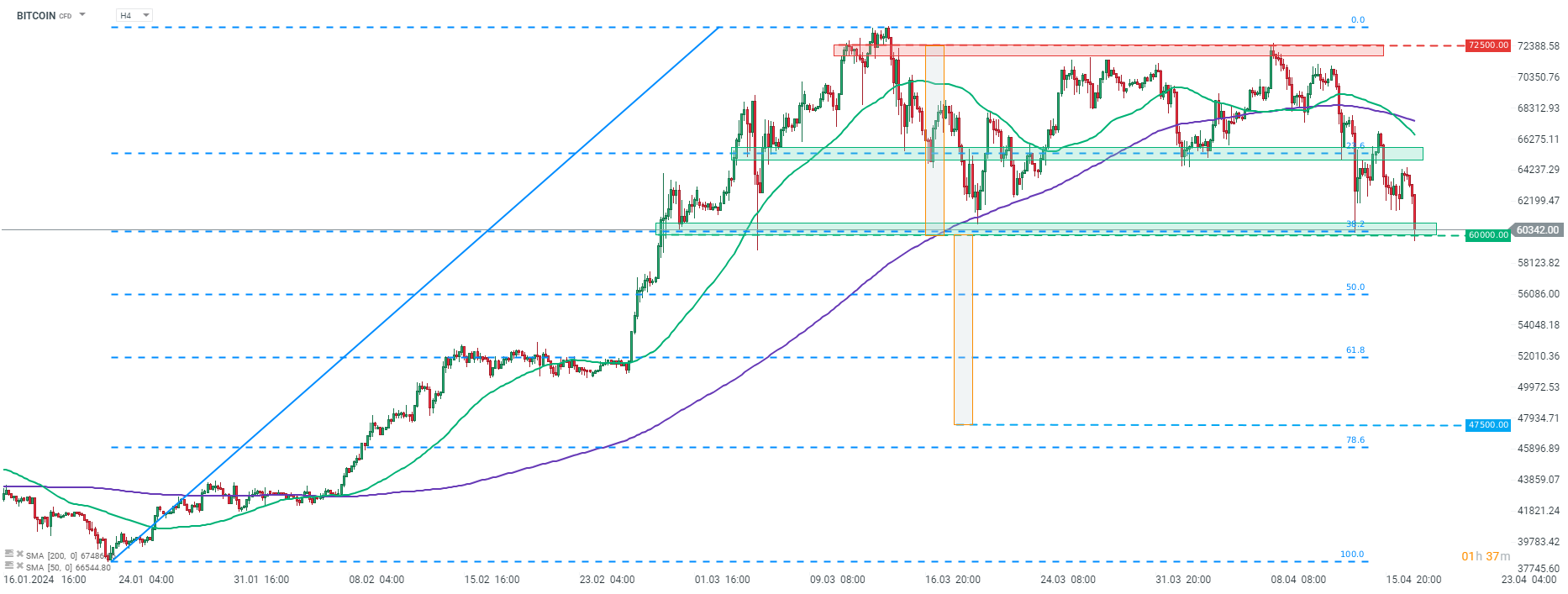 Při pohledu na graf BITCOIN v intervalu H4 vidíme, že se mince od začátku března 2024 obchoduje převážně do strany. Rekordních maxim bylo dosaženo 14. března 2024 nad hranicí 73 000 USD, ale od té doby se cena obchoduje převážně do strany v rozmezí 60 000 až 72 500 USD. Pokračující stahování rizikových aktiv, včetně kryptoměn, zatlačilo BITCOIN na spodní hranici obchodního rozpětí. Nejznámější kryptoměna se poprvé od 5. března 2024 krátce obchodovala pod hranicí 60 000 USD. Kromě psychologického charakteru je oblast 60 000 dolarů zároveň vyznačena 38,2% retracementem vzestupného impulsu započatého koncem ledna 2024.