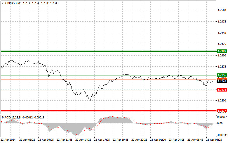 Scénář č. 2. Libru dnes plánuji koupit také v případě dvou po sobě jdoucích testů ceny 1,2323 v době, kdy se bude ukazatel MACD nacházet v přeprodané oblasti. To omezí potenciál pohybu nástroje směrem dolů a povede k obratu trhu směrem vzhůru. Můžeme očekávat růst k protějším úrovním 1,2356 a 1,2409.