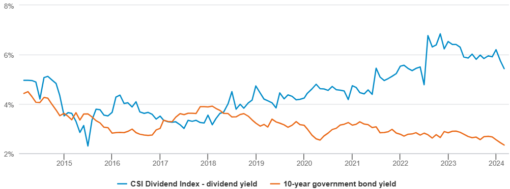 Zdroj: Wind Information, Fidelity International, duben 2024. Poznámka: Údaje jsou výnosy čínských desetiletých státních dluhopisů a klouzavé dividendové výnosy indexu CSI Dividend ke konci každého měsíce.