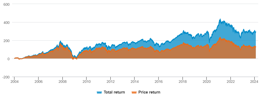 Zdroj: Bloomberg, Fidelity International, duben 2024. Poznámka: Graf ukazuje kumulativní cenový výnos a celkový výnos indexu MSCI AC Asia Pacific ex Japan od ledna 2004. Přepočteno na 0 k 1. lednu 2004. Celkový výnos se skládá ze zhodnocení ceny akcií (cenový výnos) a výnosu z dividend. Dividendový výnos tvořil 56 % celkového výnosu v letech 2004 až 2024.