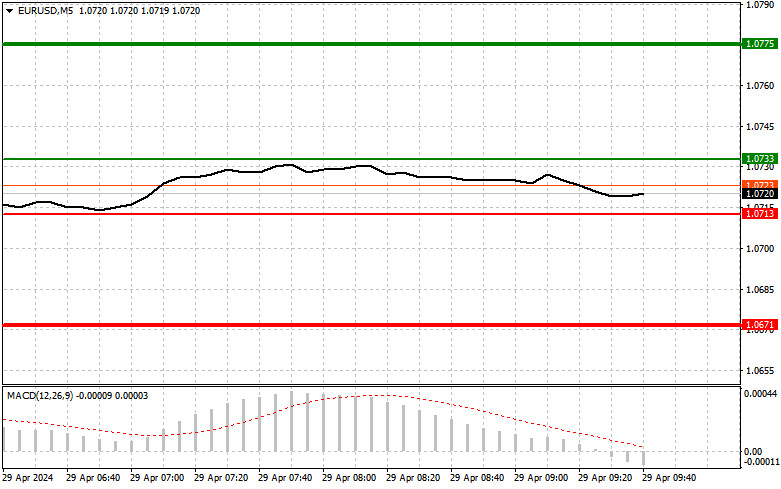Cena 1,0713 byla odpoledne otestována v době, kdy se indikátor MACD prudce propadl z úrovně nula. Přesto jsem euro prodával, protože jsem očekával silný pohyb po zveřejnění údajů o inflaci v USA. Pár se ve výsledku propadl o více než 35 pipů. Údaje z eurozóny o změnách agregátu peněžní zásoby M3 a objemu úvěrů soukromému sektoru ráno nevyvinuly žádný tlak, takže pár EUR/USD měl stále šanci růst. Americký index výdajů na osobní spotřebu (PCE) ale podpořil dolar, protože údaje předčily odhady ekonomů a posílily obavy, že období vysokých úrokových sazeb Federálního rezervního systému bude prodlouženo. Účastníci trhu mohou dnes sledovat zveřejnění údajů o inflaci ve Španělsku a Německu. Obchodníci se samozřejmě zaměří na Německo, ale aby trh projevil konkrétní reakci, musí se údaje výrazně odchýlit od prognóz. Fakt, že ceny v Německu mohou růst už čtvrtý měsíc v řadě, mluví sám za sebe a vše uvedené může nepřímo ovlivňovat plány Evropské centrální banky. Pokud jde o intradenní strategii, budu se spoléhat spíše na realizaci scénářů č. 1 a č. 2.