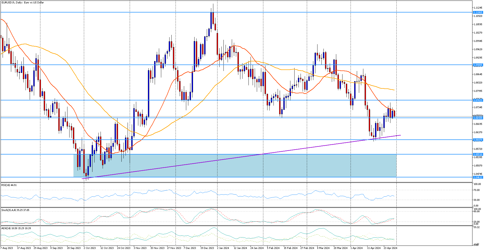 Měnový pár EUR/USD se po zprávě o inflaci, která byla 10. dubna horší, než se očekávalo, dostal pod silný prodejní tlak a zaznamenal nové minimum pro rok 2024 na úrovni 1,0600. Ačkoli od té doby pár znovu získává půdu pod nohama, ukazatele hybnosti jsou stále nakloněny směrem dolů. Pokud by došlo k obnovení odrazu, nedávná rezistence na úrovni 1,0752 by se mohla ukázat jako první překážka, kterou by cena měla překonat. Po zdolání této barikády by býci mohli zaútočit na kurz 1,0795, což je oblast, která v průběhu roku 2024 působila jako support i rezistence a překrývá se s 200denním jednoduchým klouzavým průměrem (SMA). Překonání této zóny by mohlo připravit půdu pro dosažení zářijového maxima na úrovni 1,0884. Případně by pohyb směrem dolů mohl narazit na okamžitou podporu na únorovém minimu 1,0694. Při proklouznutí pod tuto spodní hranici by cena mohla otestovat nedávný support na úrovni 1,0673. Ještě níže by se mohlo dostat pod drobnohled pětiměsíční dno na úrovni 1,0600. EUR/USD se v posledních několika seancích zotavuje, ale ukazatele hybnosti naznačují, že medvědi mají stále navrch. Ke zlepšení krátkodobého vývoje je tedy zapotřebí prolomení 200denního SMA.