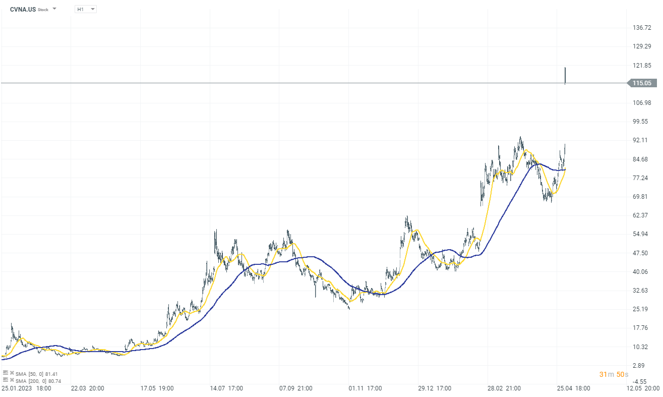 Carvana (CVNA.US) po úspěšném prvním čtvrtletí vzrostl o více než 35 %, když se prodalo 91 878 vozů, což představuje 16% meziroční nárůst navzdory menším zásobám a sníženým marketingovým výdajům. Jedná se o třetí po sobě jdoucí čtvrtletí s kladným čistým ziskem, přičemž upravený zisk EBITDA převyšuje náklady. Společnost Carvana očekává, že ve 2. čtvrtletí bude pokračovat v růstu, zvýší se prodeje i ziskovost.
