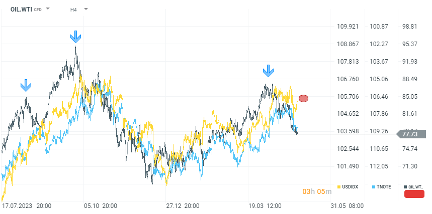 Chování dolaru v nadcházejících týdnech by mohlo být přímým ukazatelem směru vývoje akciových indexů a dalších rizikovějších aktiv. Proto je klíčové určit potenciální směry. Poslední týdny byly obdobím revize očekávání investorů ohledně prvního letošního snížení úrokových sazeb. Současná, poměrně jestřábí, očekávání zvýšila hodnotu méně rizikových aktiv, jako je například dolar. Z tohoto důvodu se teoreticky potenciál pro další zvyšování vyčerpal. Po rozhodnutí Fedu a slabších zprávách z trhu práce jsme pozorovali klidnější nálady a odliv kapitálu z dolaru. Tyto poklesy podpořily také klesající ceny ropy (OIL.WTI) a rostoucí ceny desetiletých dluhopisů (TNOTE), které jsou přímo korelovány s dolarem. V níže uvedeném grafu vidíme, že pohyby na TNOTE a ropě indikují další pokles USDIDX. Za předpokladu pokračování trendu v tomto směru tedy můžeme očekávat trvalý tlak na dolar.