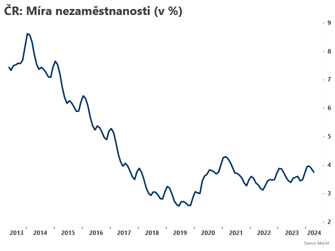 Míra nezaměstnanosti v Česku se v květnu v souladu s většinou expertních očekávání snížila na 4,2 procenta. To je její letošní nejnižší úroveň. Loni v květnu činila 3,6 procenta. Jedná se o nejvyšší květnovou nezaměstnanost za všechny roky počínaje rokem 2017. Zároveň je to letošní nejnižší míra nezaměstnanosti, neboť v červnu lze očekávat setrvání na nynější úrovni 4,2 procenta a ve druhé polovině roku pak vzestup míry nezaměstnanosti až na prosincovou úroveň 4,8 procenta. Nárůst míry nezaměstnanost na maxima za posledních osm let má na svědomí zejména snižování stavů zaměstnanců v průmyslu, který se trvaleji potýká s dopady problémového vývoje německé ekonomiky, s poměrně vysokými úrokovými sazbami či s nárůstem cen energií v posledních letech. -
