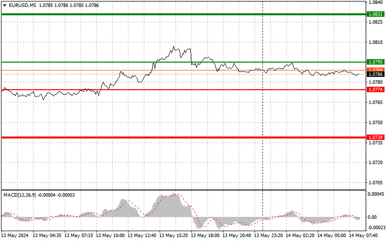 Cena 1,0777 byla otestována v době, kdy byl indikátor MACD daleko od úrovně nula. Zmínil jsem ale, že budu jednat bez ohledu na jeho hodnoty, protože celý výpočet vycházel ze silného pohybu, ke kterému došlo po zveřejnění dat. Obchodníci mohli ve výsledku získat více než 60 pipů, pokud euro nakoupili na úrovni 1,0777. Výsledek včerejšího zasedání Federálního rezervního systému byl vcelku očekávaný. FOMC přehodnotil svůj postoj na výrazněji jestřábí, ačkoli inflace v USA klesala už druhý měsíc po sobě. Uvedené ukazuje na dlouhodobější vyčkávací postoj a pozdější snížení úrokových sazeb v tomto roce – pokud bude vůbec nějaké. Z tohoto důvodu by se americký dolar neměl zatím odepisovat a býčí trh se nikam nechystá. -