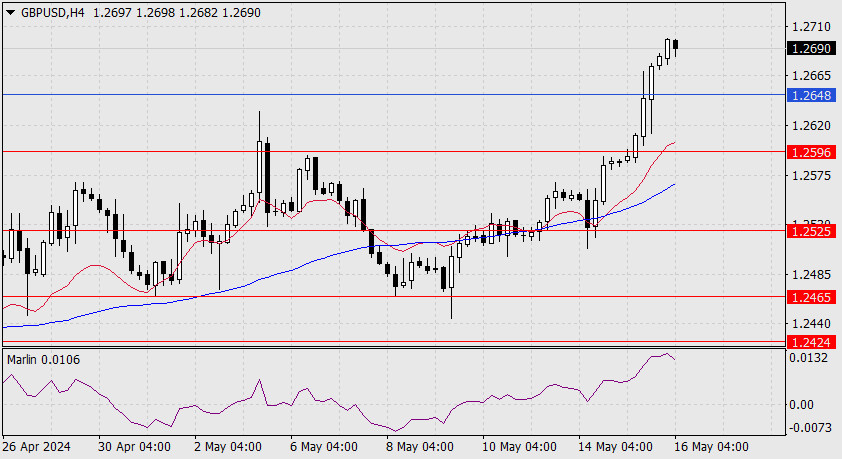 Navzdory našemu očekávání britská libra včera po snížení sazeb Evropskou centrální bankou vzrostla. Dnes ráno cena dosáhla cíle na úrovni 1,3141 (vrchol z července 2023) a oscilátor Marlin konsolidoval v pozitivním teritoriu. Cíl na úrovni 1,3220 je nyní otevřený. -